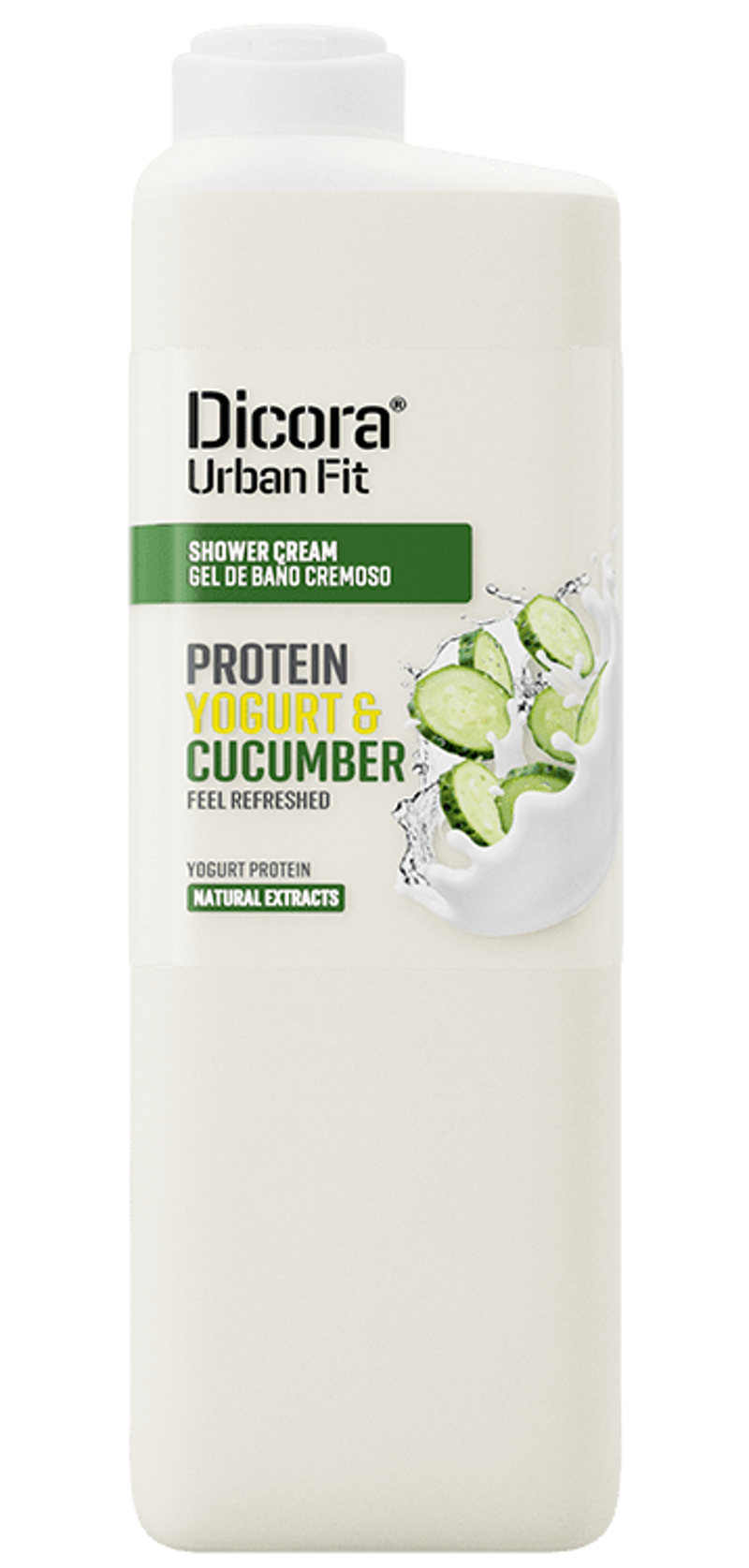 Gel doccia cremoso arricchito con proteine di yogurt e cetriolo.