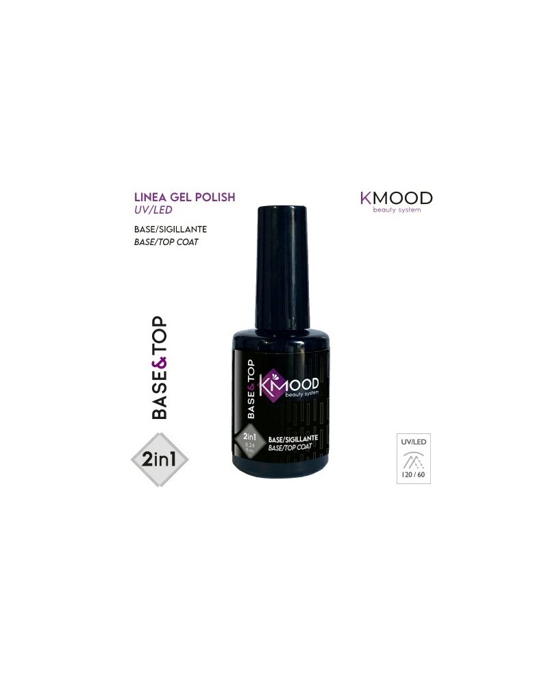 Kmood Gel Polish Base & Top è uno smalto con funzione di base e finitura per sistema semipermante. Si applica prima e dopo il colore. Asciuga 120 secondi in lampada uv e 60 secondi in lampada led.