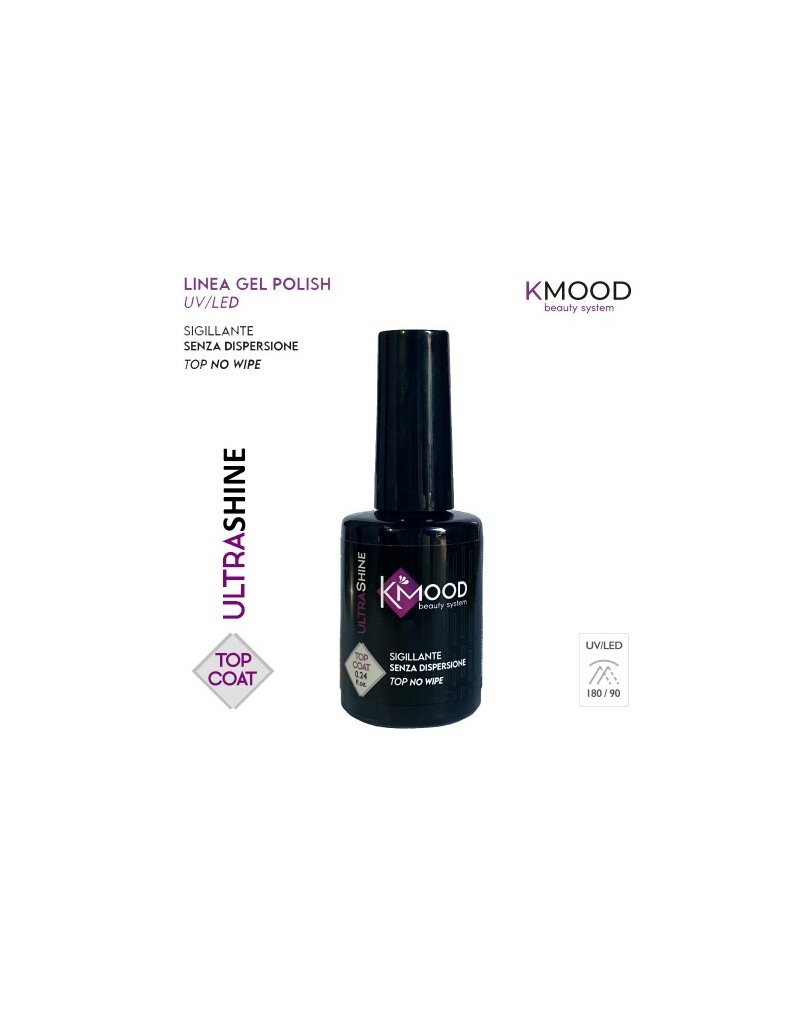 Kmood Ultrashine Top Coat è un gel di finitura extra lucido per un effetto gloss a lunga durata. Non rilascia dispersione quindi non ha necessità di essere sgrassato. Polimerizza 120 secondi in lampada uv e 90 secondi in lampada led.